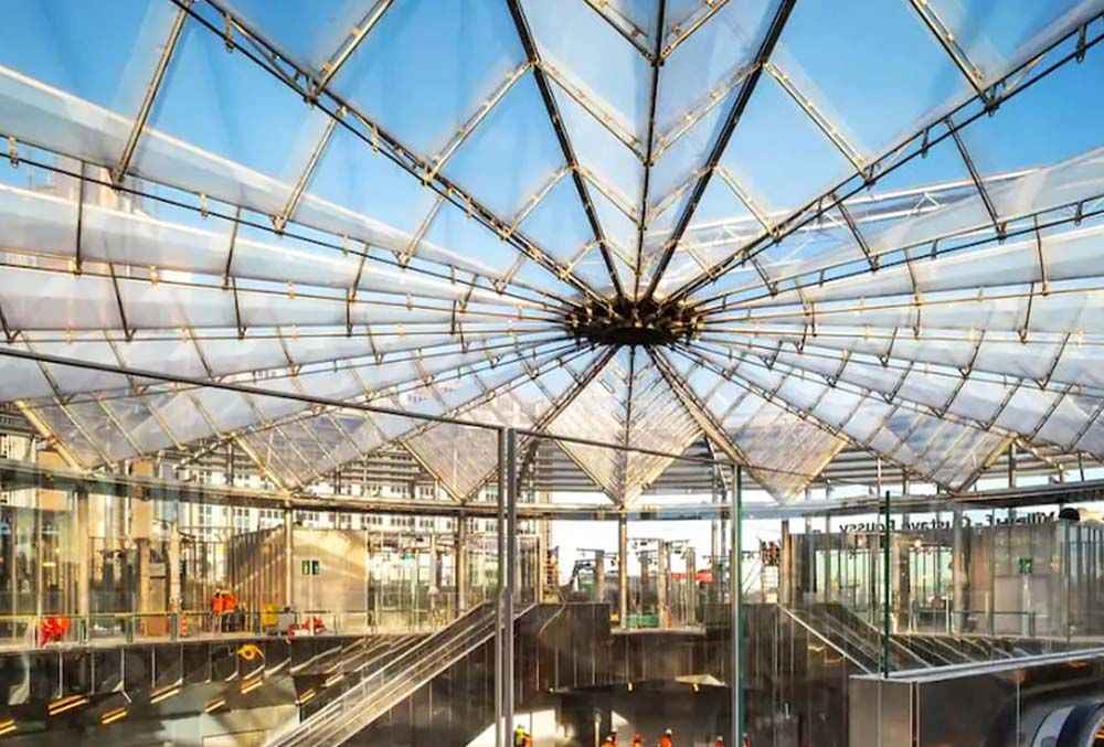 Émergeant d’un vaste parvis piéton, le pavillon d’accès s’ouvre sous une verrière monumentale qui abolit la frontière entre ville et souterrain.