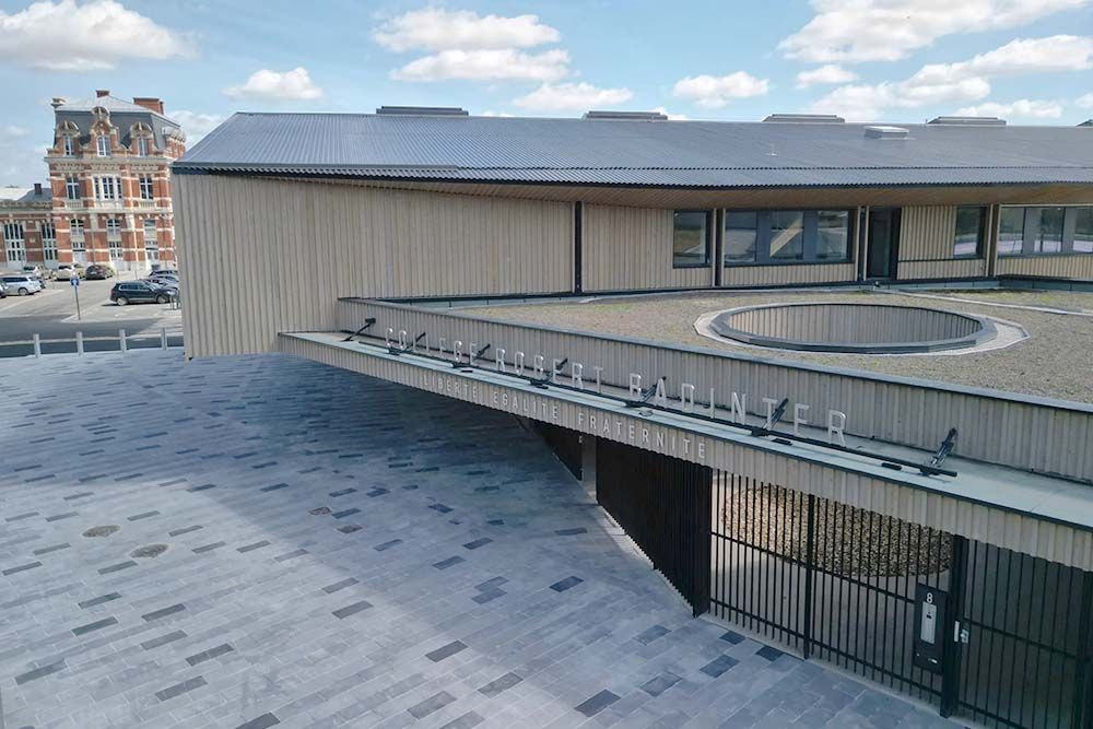 Le studio d’architecture français Coldefy, en collaboration avec Relief Architecture, a achevé le Collège Robert Badinter, la première école à ossature bois du Nord de la France, pouvant accueillir 650 élèves. L’école est implantée sur un ancien terrain de triage, à proximité de la gare de la ville et à dix minutes à pied du centre-ville.