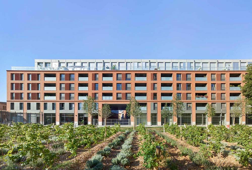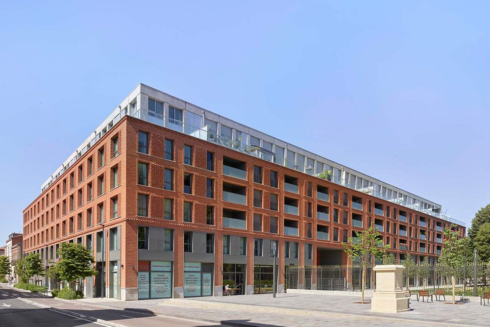 A cet égard, nos choix se sont portés vers un système bâti tramé, inspiré de la massivité de l’hôpital. Cependant, nous privilégions de larges ouvertures en relation avec les pièces principales et les espaces extérieurs. La qualité des matériaux de constructions apparait comme primordiale : la brique et la pierre sont privilégiées. La justesse du dessin des façades, ses vibrations et le travail sur la profondeur permettent à la lumière naturelle de créer des variations subtiles. La réduction de 30% de l’emprise au sol et la plantation de plus de 50 arbres participent à la respiration du quartier et à sa renaturation. Le site bénéficie également d’une accessibilité exemplaire : station de métro Saint‑Cyprien, 11 lignes de bus et 7 stations VélÔToulouse à moins de 5 minutes. Cette situation renforce sa vocation de pôle urbain majeur.