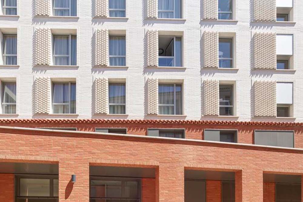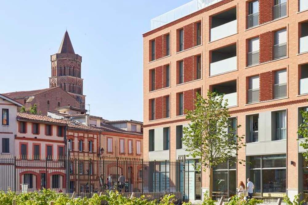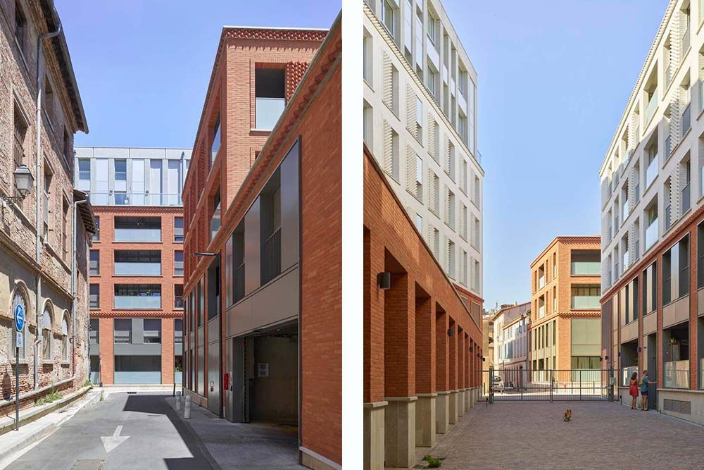 Le choix de la brique foraine, typique de Toulouse, s’impose comme élément structurant. Sa texture irrégulière, sa porosité et ses nuances chromatiques permettent de retrouver la vibration des façades anciennes tout en affirmant une modernité maîtrisée. Trois teintes de brique ont été mélangées après prototypage afin d’obtenir une palette cohérente avec les constructions historiques de La Grave. Les encadrements, corniches et modénatures ont été composés en brique moulée ou découpée, créant des jeux d’ombre subtils tout au long de la journée. Les attiques, traités en béton préfabriqué et aluminium clair, assurent une transition harmonieuse entre socle minéral et ciel.
