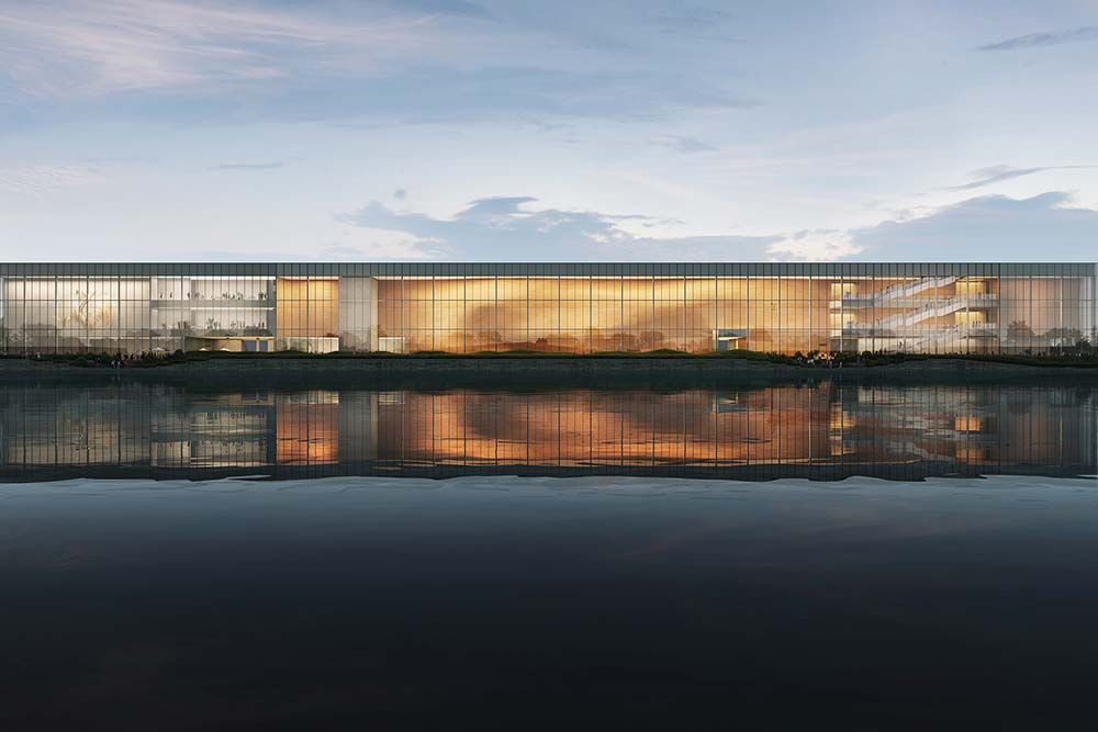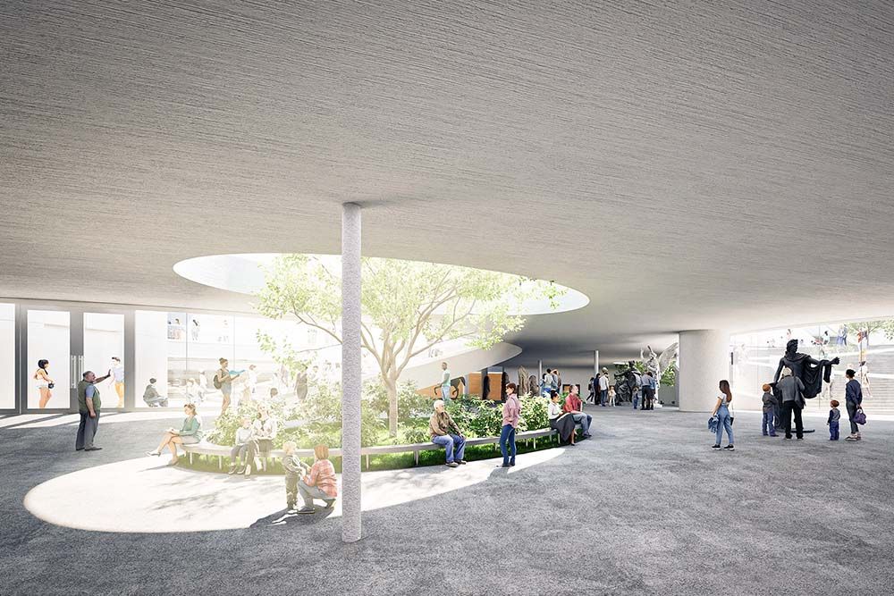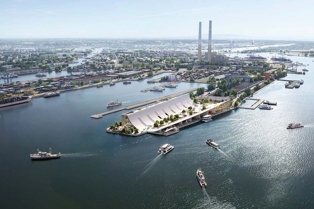 Un élément architectural structurant du projet réside dans l’extension de la toiture courbe existante, prolongée en une couverture continue le long du quai. Cette couverture organise les circulations, génère des espaces extérieurs ombragés et établit une transition spatiale entre les cheminements urbains et les activités portuaires. Sous cette toiture prolongée, une série d’espaces publics semi-ouverts et une cour abritée sont aménagés, permettant un accès depuis la promenade urbaine comme depuis l’eau. Le musée est ainsi conçu comme un environnement public connecté, plutôt que comme une destination isolée de son contexte.