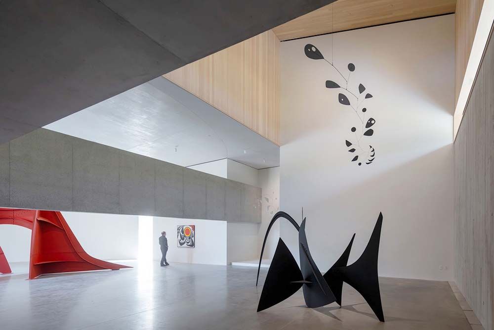 À l’intérieur, les galeries serpentent entre des murs de béton clair, des ouvertures tamisées et des perspectives vers le ciel. Les mobiles et stabiles de Calder, suspendus dans des puits de lumière, semblent flotter dans un calme presque religieux.