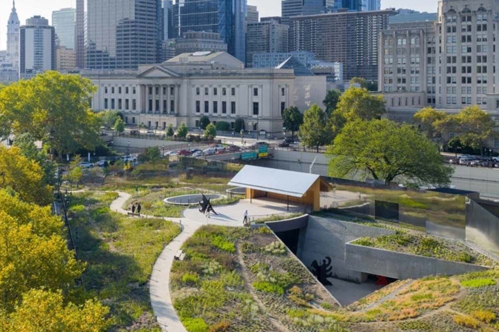 Implanté au cœur de Philadelphie, entre le musée Rodin et la Barnes Foundation, le lieu a été pensé pour s’effacer dans le tissu existant. Son toit végétalisé abrite plus de 250 espèces de plantes.