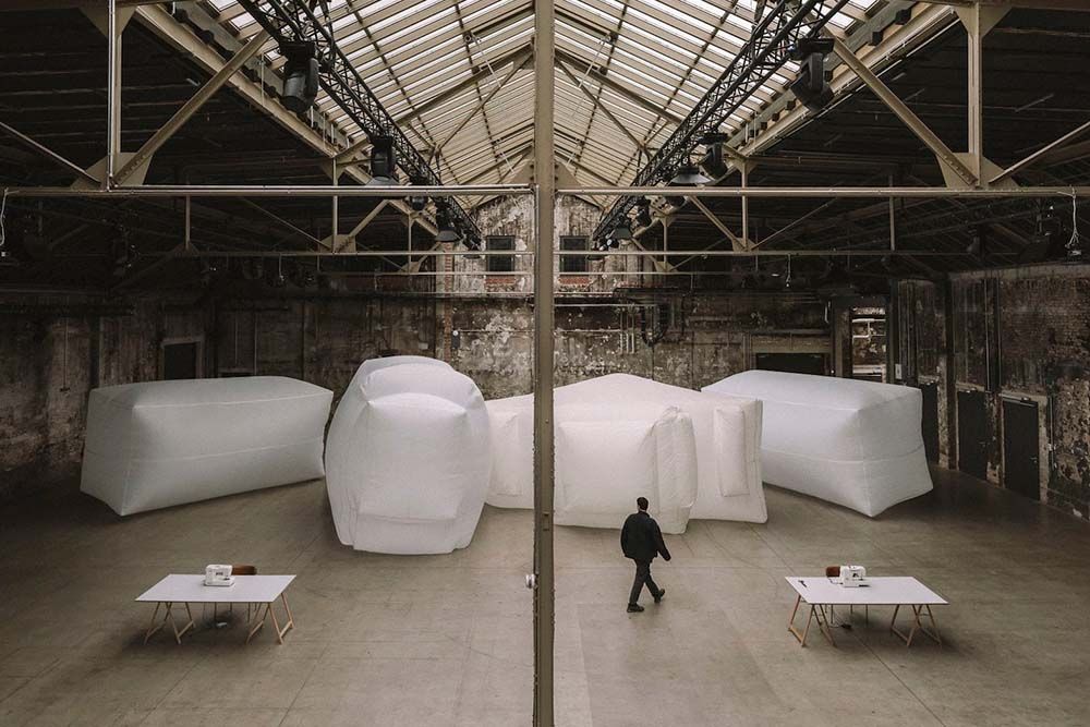 Au fur et à mesure que l’installation passe d’une phase à l’autre, l’impression de plénitude éclatante cède la place à une impression de vide apparent, et de nouvelles formes émergent des anciennes. Observer l’œuvre, c’est comme assister en accéléré à la transformation inexorable de structures monumentales. Le volume intérieur se déploie, s’élevant toujours plus haut jusqu’à atteindre les limites de sa paroi transparente. Une fois vidé d’air, il s’effondre. Puis, un souffle de vie relance le processus.
