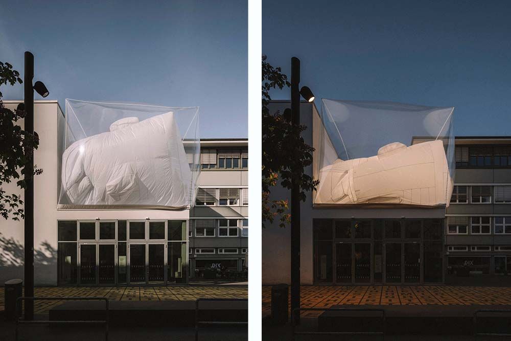 L’objet, réalisé en soie de parachute blanche recyclée, absorbe et libère l’air à intervalles prédéfinis. Cette répétition ininterrompue évoque le changement constant : au musée, où les expositions et l’architecture muséale sont régulièrement montées puis démontées ; dans la ville, en perpétuelle évolution ; et dans tous les matériaux qui s’érodent presque imperceptiblement au fil du temps.