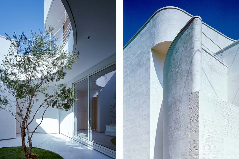 Pour protéger l’intérieur des regards tout en conservant une relation étroite avec l’extérieur, la maison a été conçue naturellement autour d’un patio central. Afin que les occupants puissent profiter confortablement des espaces proches des fenêtres ou de la cour, de larges débords de toiture filtrent la lumière intense de l’été. L’extérieur, enduit d’un blanc évoquant Santorin, reflète la vision de resort souhaitée par le client.