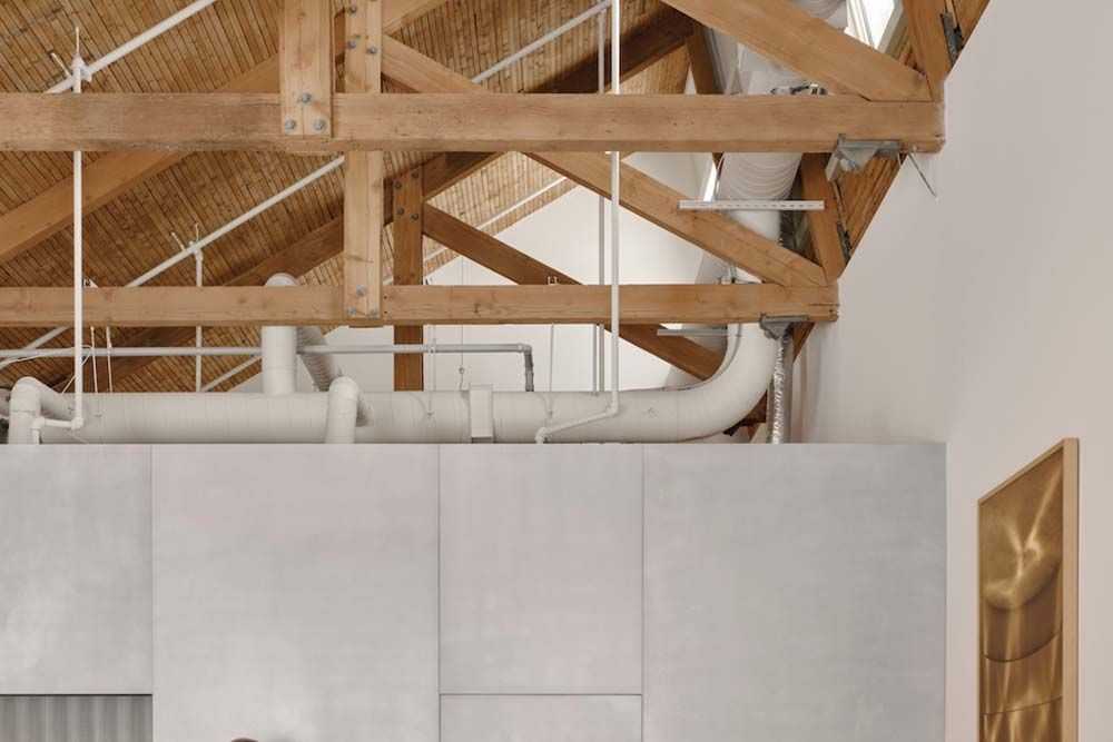 Le projet conserve et sublime la structure d’origine. Masqué dans l’ensemble du bâtiment sous les couches de peinture successives, cet élément fondamental du lieu est révélé. Les plafonds en planches, les fermes de bois massif, les poutres et colonnes de béton ont été nettoyées avec soin au jet de sable pour retrouver leurs textures centenaires et leurs teintes naturelles. La dalle de sol a été nettoyée et scellée, préservant et exposant aux visiteurs les traces de plus d’un siècle d’histoire et d’activités. De nouvelles percées en toiture sont ouvertes pour laisser entrer la lumière naturelle, réactivant ainsi les qualités spatiales du bâtiment dont le toit en dent de scie avait été obstrué au fil du temps.