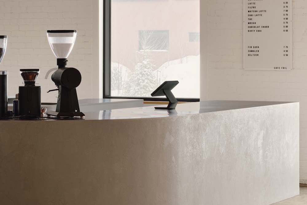 À l’avant de l’espace reconverti, le café lumineux s’ouvre sur le Parc des Gorilles par une grande porte de garage vitrée, accueillant les visiteurs dans une atmosphère à la fois brute et raffinée. Le comptoir courbe, aux lignes douces et minimalistes, est recouvert d’un enduit de microciment artisanal qui évoque la continuité avec la matérialité du lieu. À l’arrière, une salle de projection fermée offre un cadre intime pour les œuvres audiovisuelles et les événements immersifs. Le mobilier sur mesure du café, conçu par le designer montréalais Raymond Raymond, introduit une chaleur sobre et fonctionnelle qui contraste avec la rigueur de la structure existante. Le volume central de métal accueille un espace de travail et de rencontre, meublé d’une grande table de l’ébéniste Essai Mobilier et de chaises danoises Vipp, affirmant une esthétique épurée, à la croisée du design local et des références intemporelles.