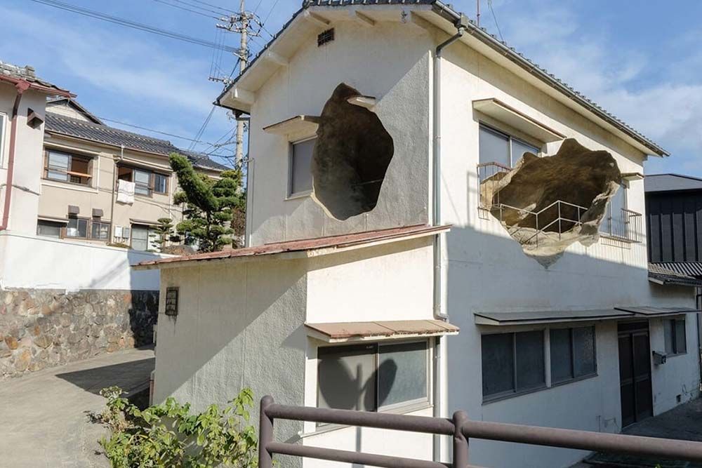 Située dans une rue résidentielle étroite, se dresse une maison discrète de deux étages qui, jusqu’à récemment, serait passée presque inaperçue. Mais cette dernière est percée de deux gigantesques ouvertures, aux contours bruts et géologiques, comme si le bâtiment avait été excavé de l’intérieur. Ce qui s’ouvre derrière la façade n’est pas une pièce, mais une caverne, une rupture qui évoque davantage une formation naturelle qu’un espace construit par l’homme.