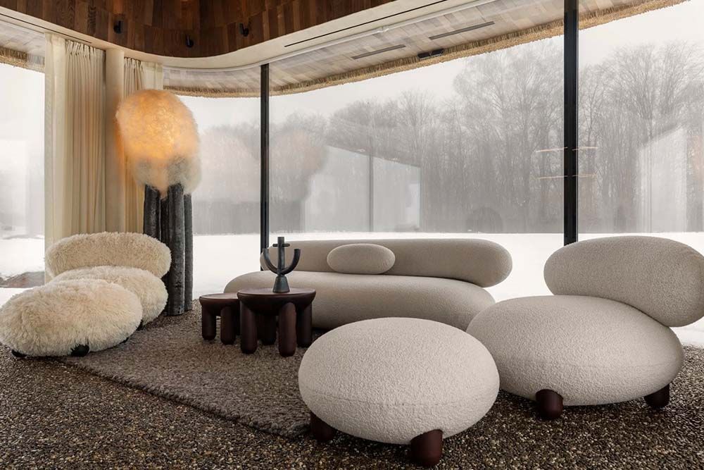Les baies vitrées ininterrompues renforcent l’impression d’immersion dans la nature, faisant du paysage une composante essentielle de l’expérience. Pour plus d’intimité, les hôtes peuvent fermer des rideaux épais mais légers, actionnés automatiquement par un panneau de commande situé près du lit.