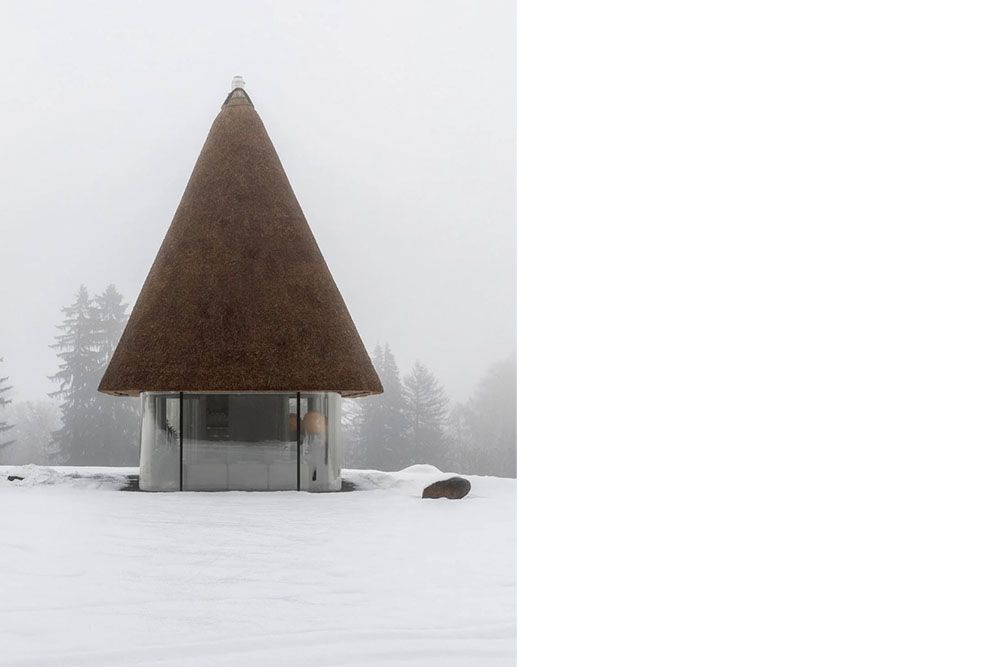 L’architecture vernaculaire ukrainienne traditionnelle s’est développée grâce à des solutions simples mais expressives : murs épais blanchis à la chaux, toits de chaume et enduits réguliers, témoignant d’un souci du détail et d’une aspiration à l’ordre et à la beauté. Dans l’interprétation contemporaine de YOD Group, cette recherche de lumière et de pureté se traduit par des façades entièrement vitrées, tandis que le toit – volontairement surdimensionné – devient l’élément architectural principal du projet. Sa forme sculpturale définit une silhouette forte et immédiatement reconnaissable, évoquant à la fois un chapeau haut-de-forme traditionnel et un champignon géant émergeant du paysage.