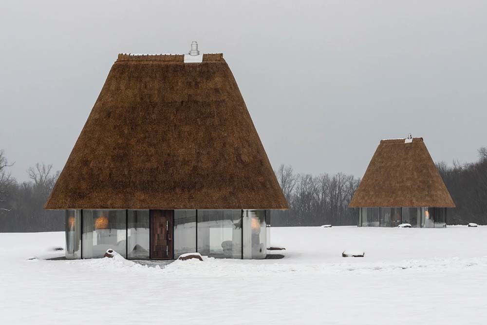 En journée, les façades entièrement vitrées se fondent visuellement, donnant l’impression que l’imposant toit de chaume flotte au-dessus du paysage. À l’intérieur comme à l’extérieur, le sol est recouvert d’un tapis de pierre continu, agréable au toucher et offrant une subtile sensation de massage lorsqu’on marche pieds nus.