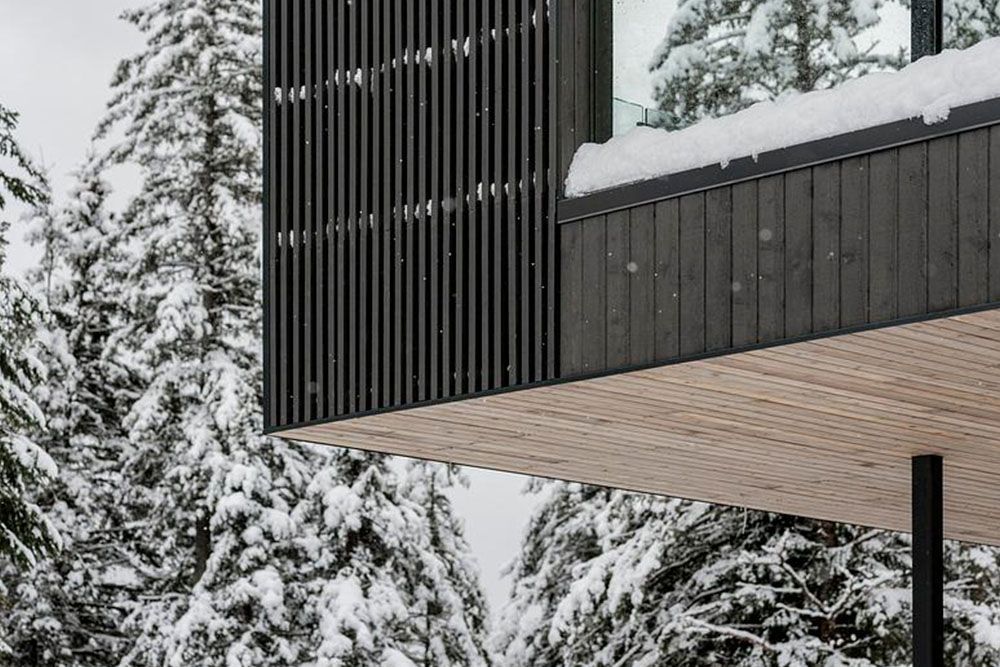 À l’approche du site, le bâtiment se fond naturellement dans la trame végétale formée par les conifères matures, s’inscrivant avec retenue au cœur de ce couvert forestier. À l’étage, les parements de bois verticaux adoptent une teinte et un rythme qui se marient avec l’écorce des arbres, tandis que le socle en pierre naturelle au rez-de-chaussée accentue l’effet de flottement du volume supérieur. Des lattes verticales, en continuité avec la volumétrie de la résidence, filtrent la lumière sur la terrasse couverte, renforçant la relation entre intérieur et extérieur. Cette terrasse se positionne dans la continuité de l’axe dégagé dans le paysage, là où traverse le pont, offrant ainsi une ouverture visuelle vers les champs. Elle relie le volume d’une extrémité à l’autre par un parcours fluide qui accompagne la déambulation le long de la rivière, en contact avec la nature sur toute la façade principale du bâtiment.