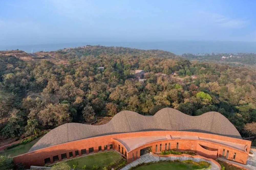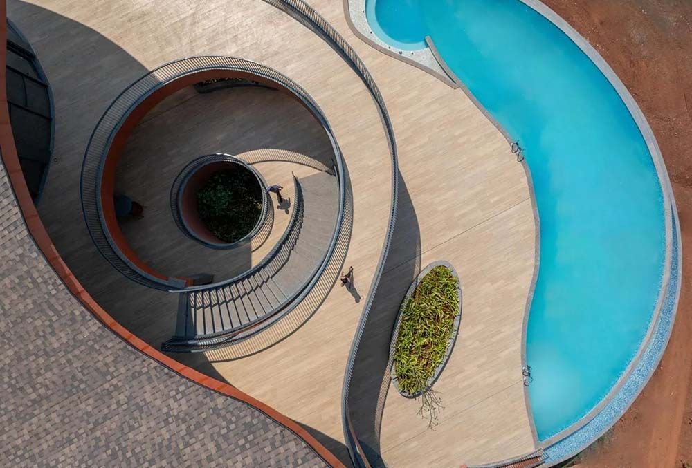 Ces volumes paraboliques abritent une salle de sport intérieure, un gymnase, un restaurant, un bar ainsi que quatre chambres d’hôtes. Chaque espace s’ouvre sur de généreuses terrasses curvilignes qui cadrent de vastes vues sur l’océan à l’ouest. Au-dessus, une toiture à courbure sectionnelle ondule au-dessus de l’ensemble : elle s’élève au-dessus des volumes principaux et s’abaisse entre eux pour délimiter des cours plus intimes. De profonds débords protègent les terrasses du soleil et des pluies de mousson.