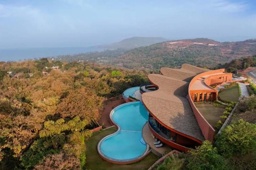 Situé sur une colline au relief abrupt dominant l’océan à Anjarle, dans l’État du Maharashtra en Inde, Crest Nine est un centre communautaire conçu comme un pôle de loisirs pour un ensemble de villas privées et dessiné par Sanjay Puri Architects. Le terrain s’abaisse fortement depuis la route d’accès, ce qui permet au bâtiment de se révéler progressivement depuis le relief naturel plutôt que de s’y poser simplement.