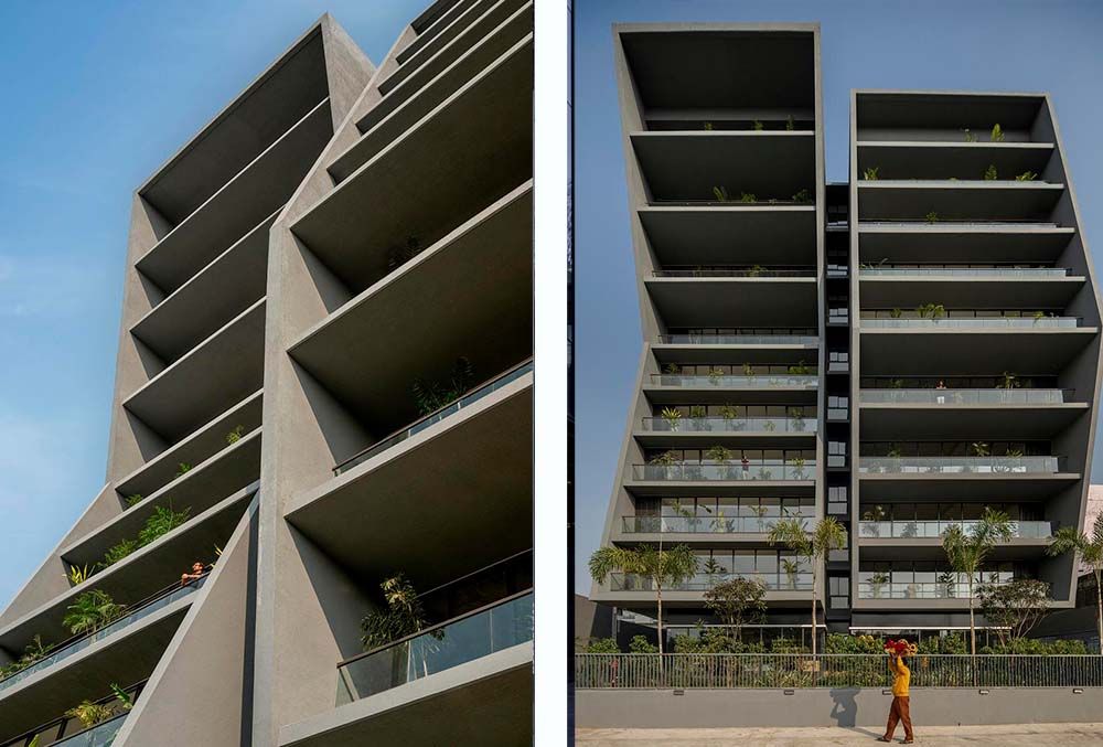 Les écrans perforés et les terrasses en retrait fonctionnent comme des dispositifs passifs de protection solaire, limitant les apports de chaleur, réduisant les besoins en climatisation et diminuant les émissions de carbone sur l’ensemble du cycle de vie du bâtiment.