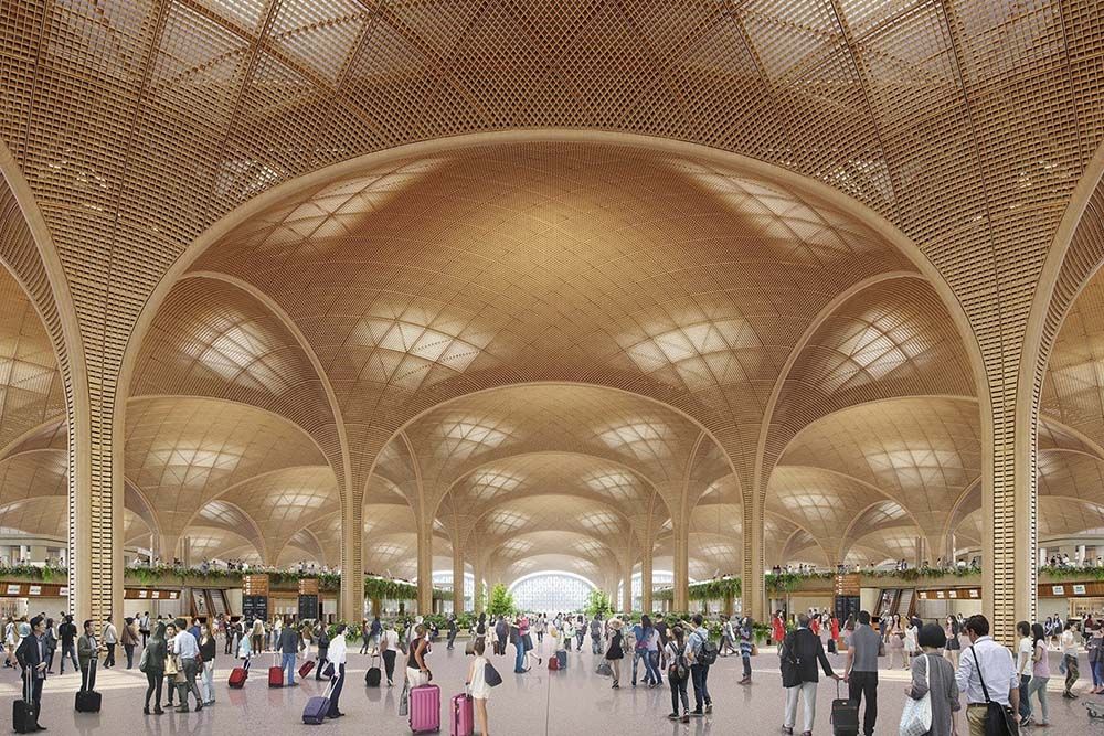 L’architecture de l’aéroport a été confiée au cabinet britannique Foster + Partners, qui a imaginé un ensemble mêlant inspiration khmère et modernité. Les dômes rappellent le tressage du bambou, tandis qu’une statue monumentale de Bouddha de neuf mètres, en position Abhayamudra, accueille les passagers dans une atmosphère de sérénité.