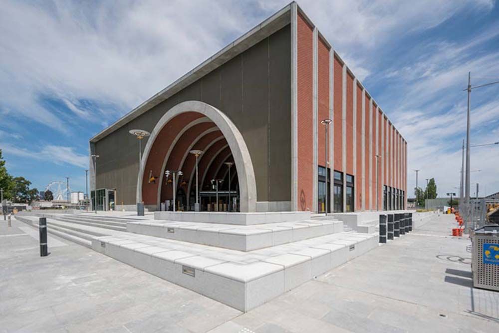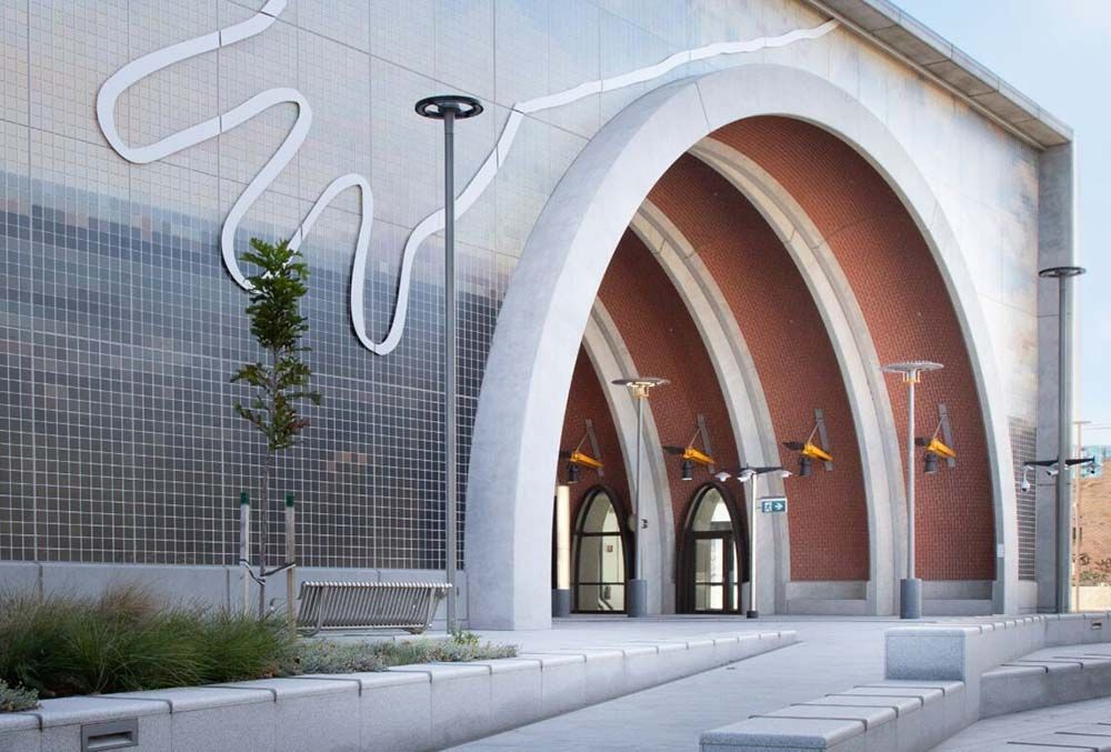Sur le plan architectural, ArdenStation se présente comme une structure sobre et monolithique, mais son caractère spatial est façonné par un geste audacieux et expressif : de grandes arches en béton apparent qui traversent le volume de manière délibérée et sculpturale. Ces arches vont au-delà de leur rôle structurel qui consiste à permettre de longues portées et une continuité, elles agissent également comme des éléments de transition et symboliques. Les ouvertures généreuses adoucissent la masse du bâtiment, créent des connexions fluides entre l'intérieur et l'extérieur, et invitent les gens à traverser la structure comme s'ils traversaient un pavillon civique. L'un des points forts du projet est la façade en céramique de 522 mètres carrés, qui intègre une œuvre d'art publique à grande échelle. Développée par Fiandre, qui fait partie du groupe italien Iris Ceramica, en collaboration avec Artedomus, elle est la plus grande façade en porcelaine personnalisée jamais installée en Australie.