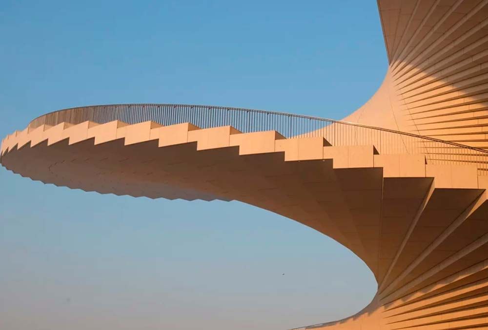 Dès le premier regard, l’architecture affirme sa force expressive. Le bâtiment se déploie comme un éventail en mouvement, évoquant la danse et la souplesse du corps. Sa toiture en spirale, pensée comme un immense escalier ascendant, dépasse la simple prouesse formelle : accessible à toute heure, elle invite le public à s’approprier le lieu, à la fois promenade, scène urbaine et point de vue sur la ville. Par ce geste ouvert, l’Opéra s’inscrit pleinement dans le quartier écologique de Houtan, affirmant sa vocation civique autant qu’artistique.