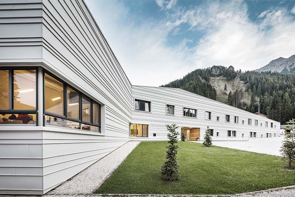 Les architectes ont délibérément écarté l’image rustique des constructions alpines traditionnelles. Leur choix s’est porté sur une écriture claire et homogène : façades et toitures en aluminium PREFALZ (P.10 blanc Prefa). Ce matériau combine légèreté, durabilité et esthétique. Son fort pouvoir réfléchissant réduit l’impact du rayonnement solaire en altitude et contribue à un confort thermique accru. L’architecture s’intègre ainsi au paysage de manière changeante : blanche et discrète l’hiver, lumineuse et contrastée l’été.