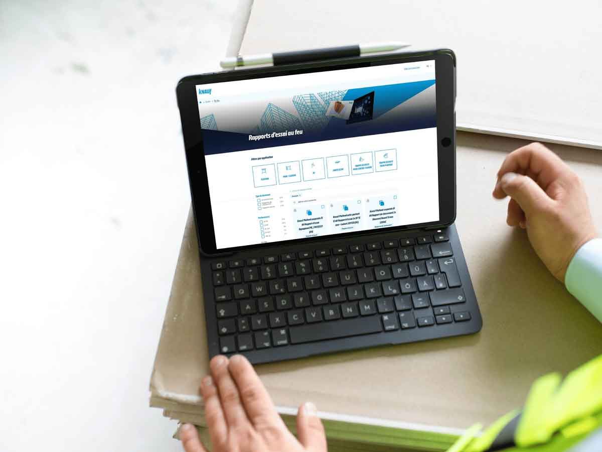 Pour aller plus loin, Knauf propose des fiches techniques détaillées, conçues pour les systèmes les plus courants. Ces documents synthétiques permettent aux professionnels d’accéder rapidement aux informations spécifiques nécessaires à leurs projets. - Un outil numérique pour consulter les rapports d’essai au feu