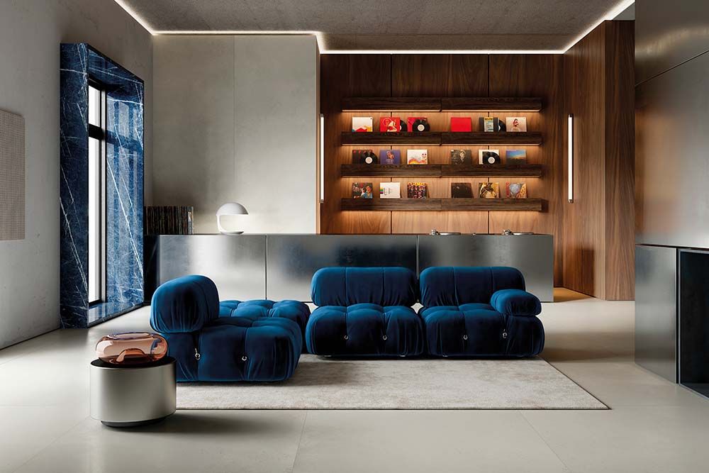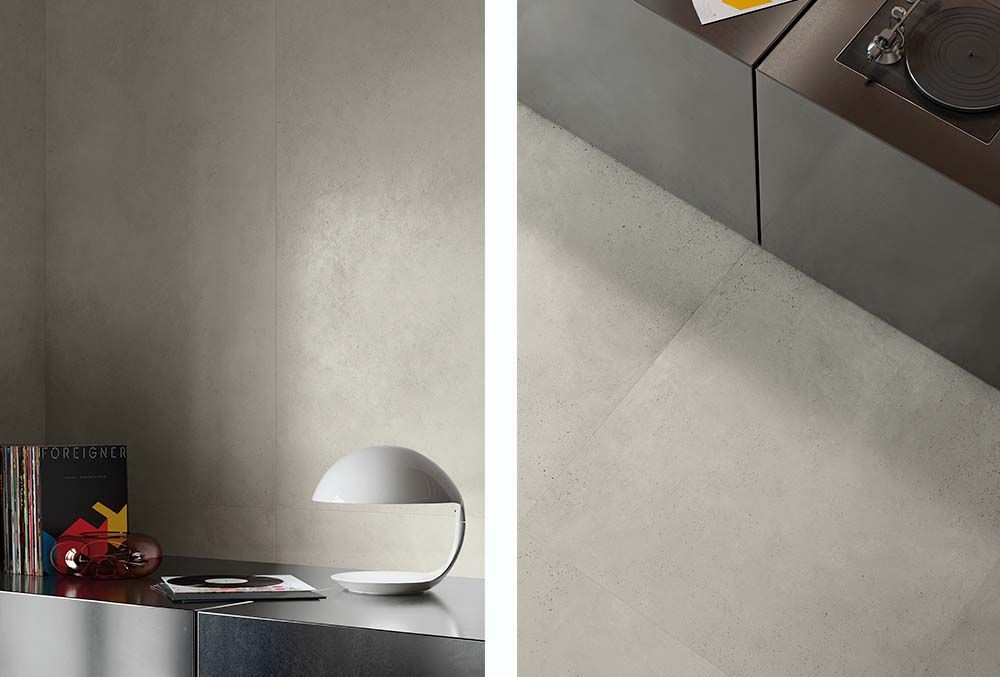 Les formats Classics offrent des dimensions plus traditionnelles (100x100 cm, 120x60 cm, 60x60 cm), disponibles avec des épaisseurs de 6 mm et 8 mm. La finition Natural Plus confère une douceur tactile au béton, le rendant parfait pour les environnements résidentiels tels que les salons, les salles de bains et les cuisines, mais aussi pour les bureaux et les espaces publics. La ligne est enrichie par le décorum Tesura, qui introduit un élément graphique discret, rappelant les empreintes laissées par les coffrages, générant une texture similaire à celle d'une grille métallique.