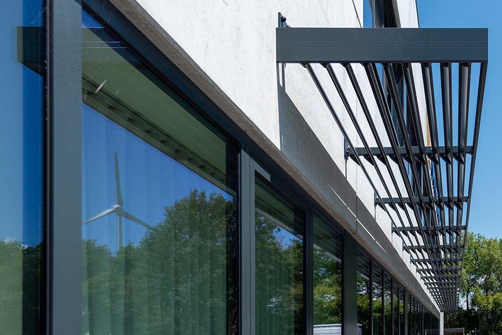 Pour ses bureaux au rez-de-chaussée, Maître André a opté pour le DucoSun 100D en sous-face système de protection solaire. Ce système de protection solaire externe permanent a été installé en tant qu’auvent en saillie juste au-dessus des fenêtres de la façade.